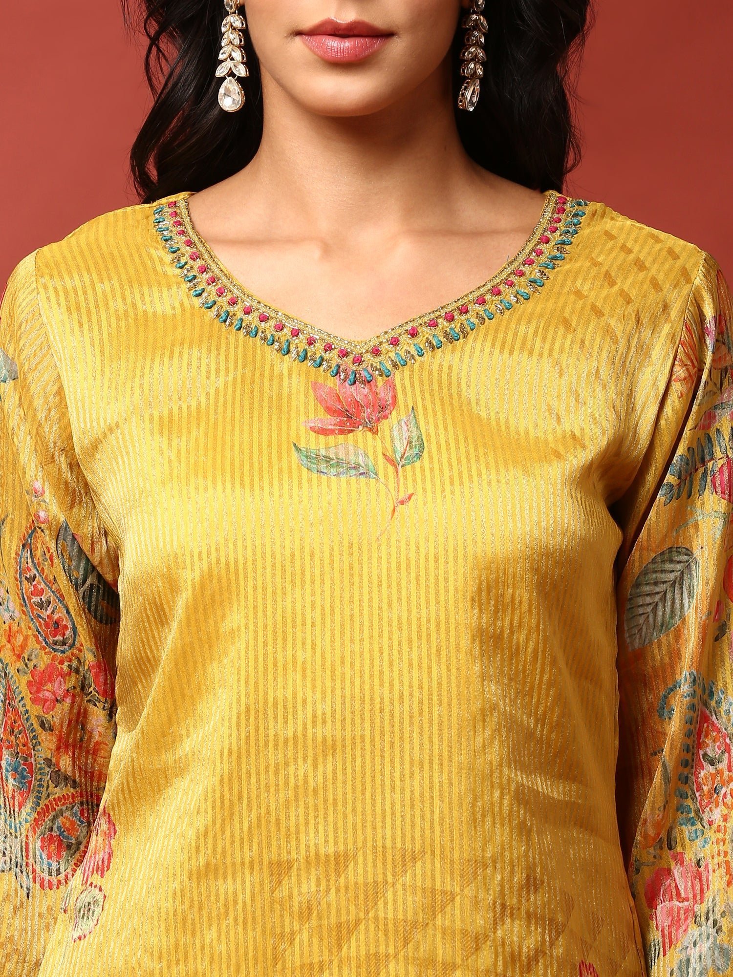 Elevate your wardrobe with this mustard floral printed crepe three-piece suit set. Crafted for comfort and style, the breathable crepe fabric drapes gracefully, while the intricate floral patterns add an elegant touch. Perfect for both formal occasions and stylish gatherings, this set combines sophistication with effortless charm.