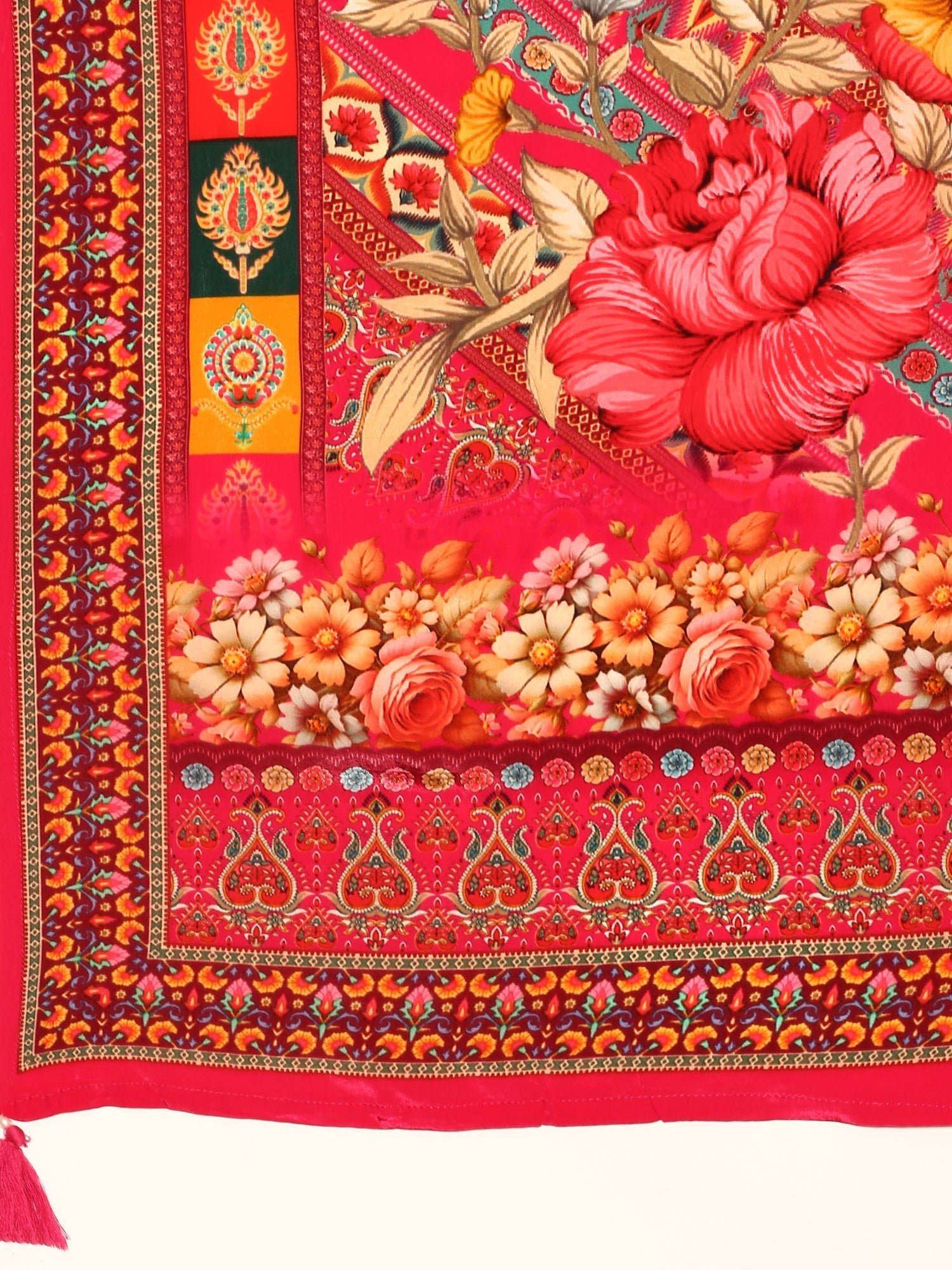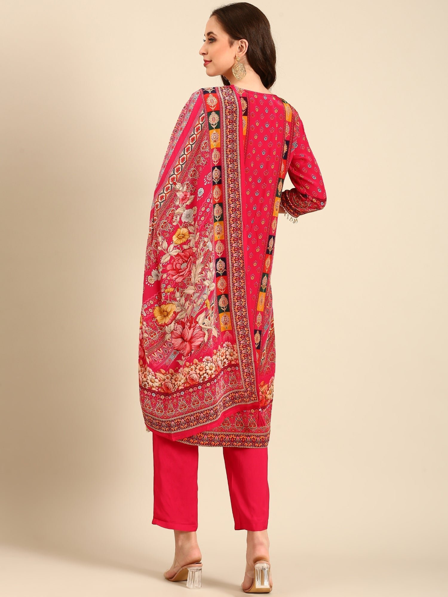 Experience elegance with this Pink Crepe Digital Print Three Piece Suit Set. Crafted from soft crepe fabric, it features a vibrant digital print enhanced with delicate kardhana embroidery and shimmering sequin accents. This combination creates a sophisticated look perfect for festive occasions or stylish everyday wear. Lightweight and comfortable, the suit ensures you stay graceful without compromising on comfort.