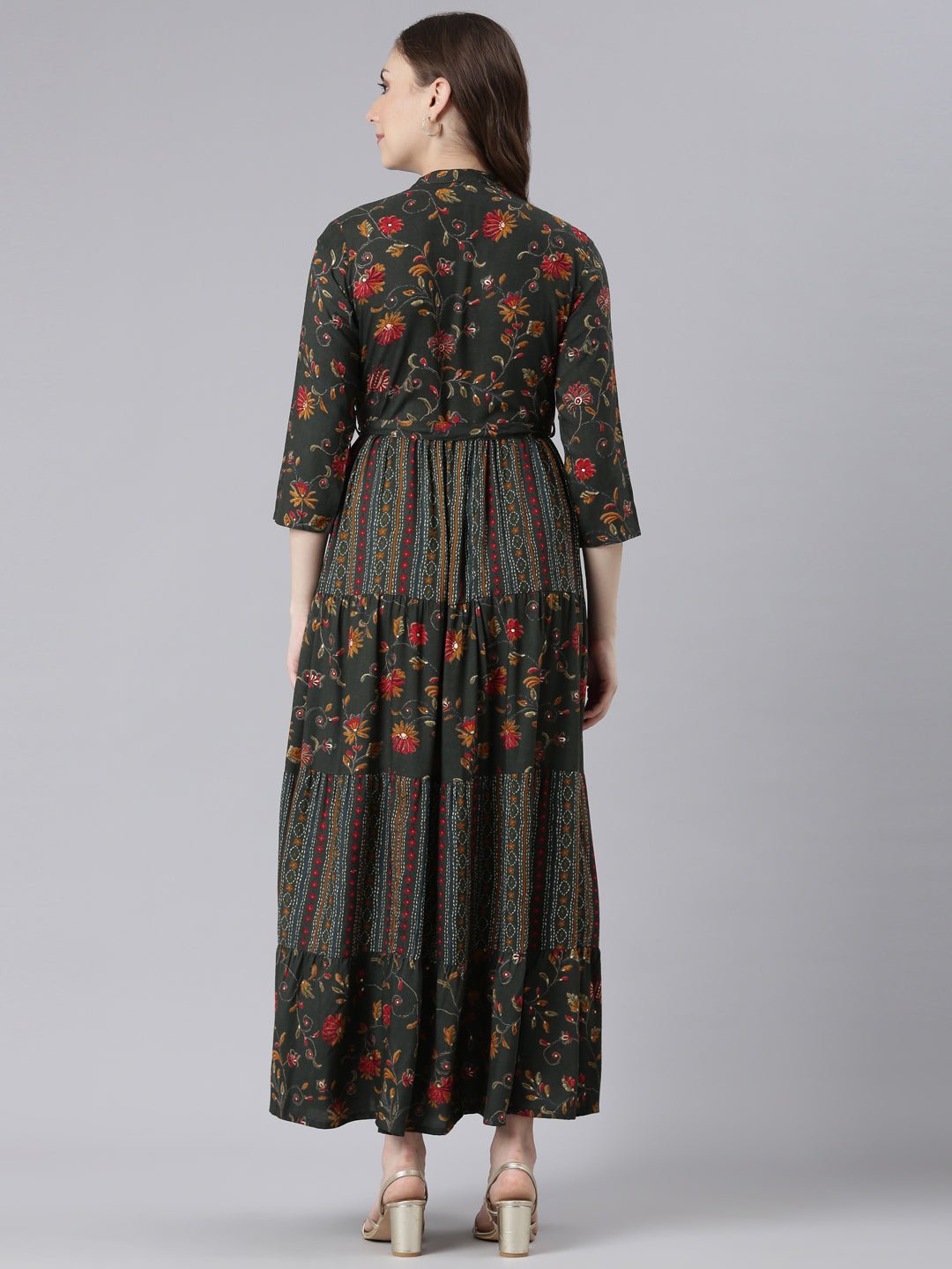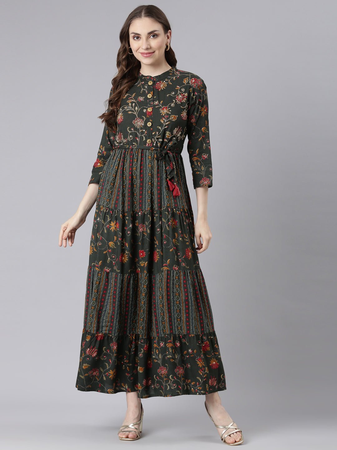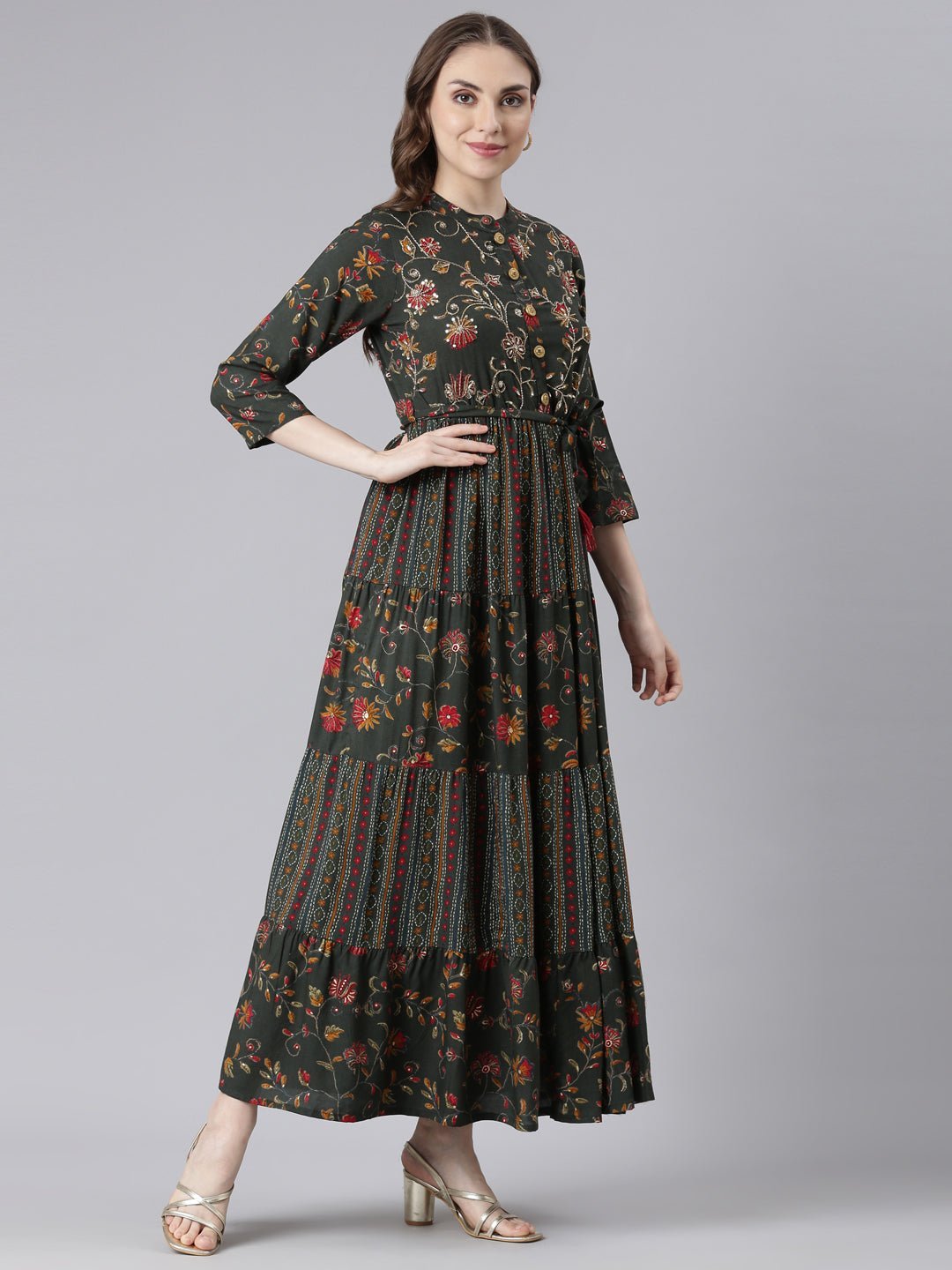 Transacthubs Olive Viscose Rayon Straight Casual Floral Maxi Dresses Elevate your everyday style with the effortless fluidity and charm of this maxi dress.